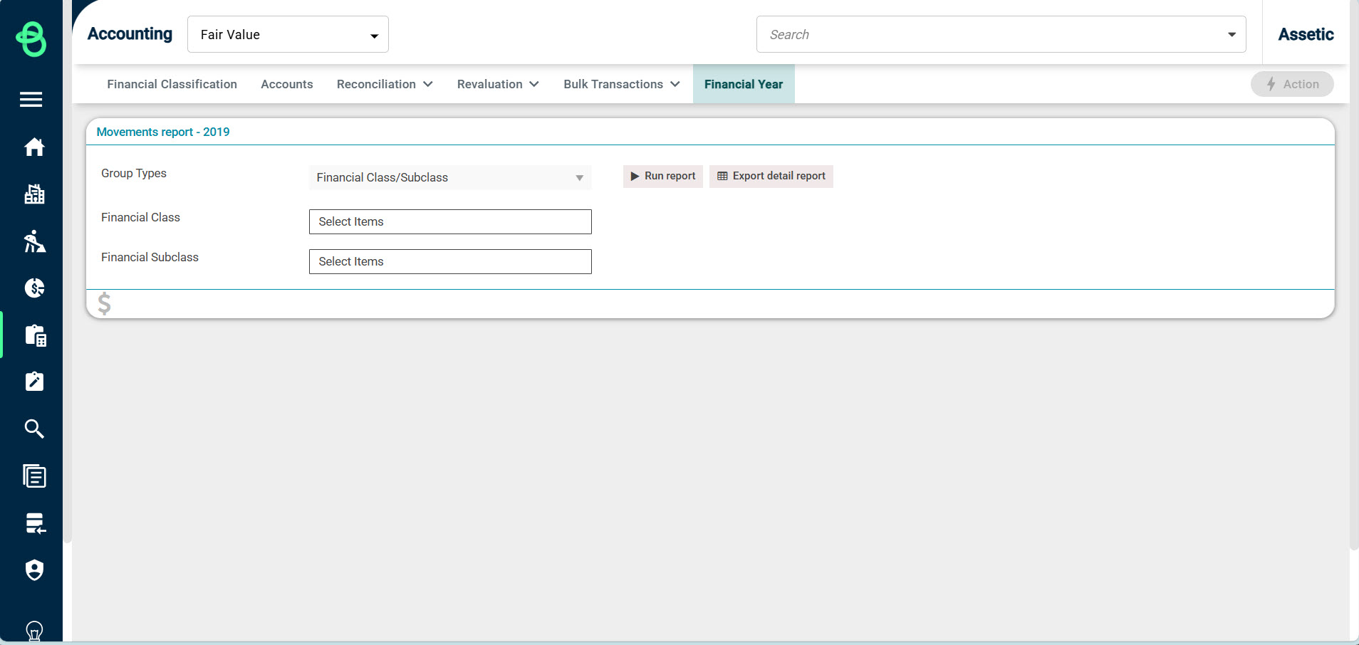From the 'Group Types' drop-down, users can select either 'Financial Class/Sub-class', 'Asset Category', or (only when a financial month is selected, not a financial year) 'Financial Class/Sub-class (year to month)', depending on the type that is needed to be grouped to run the report.