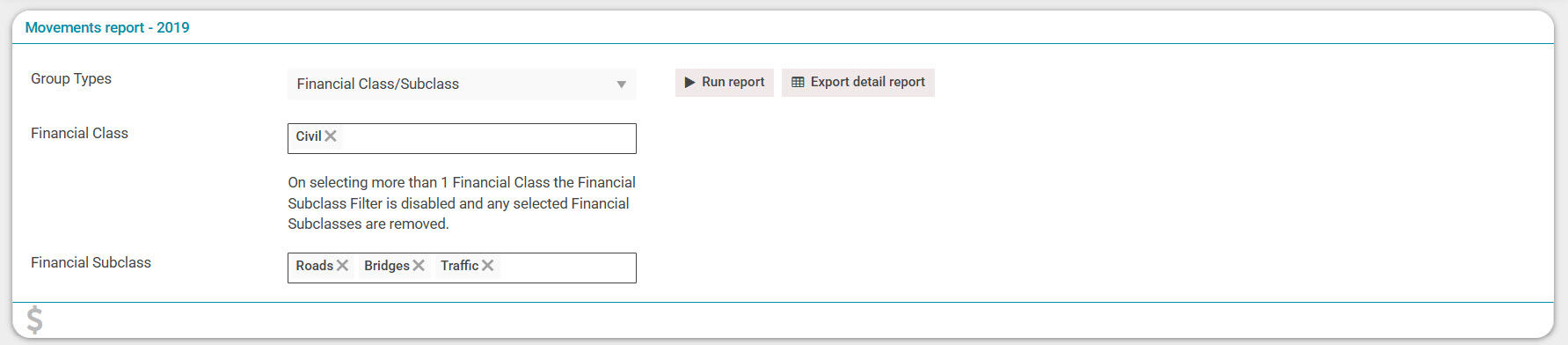 Selecting 'Financial Class/Subclass' group type to run report generates the Movements report as follows: