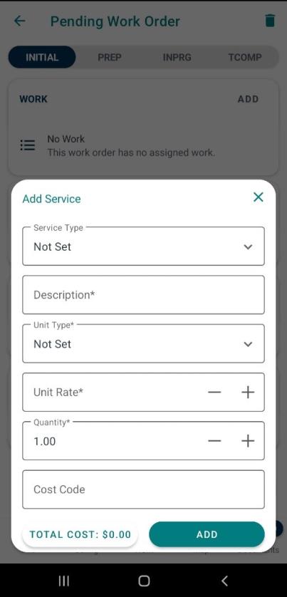 Service Type: An optional field to select a Service Activity, which will pre-fill the Description, Unit Type, and Unit Rate fields, as configured in the Maintenance Admin module.