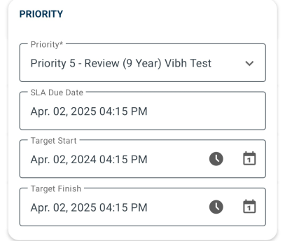 Target Finish: The Target Finish date is automatically generated based on the priority, however, it is also able to be edited manually by selecting the calendar button to change the date and the clock button to change the time. This must be set after the Target Start date.