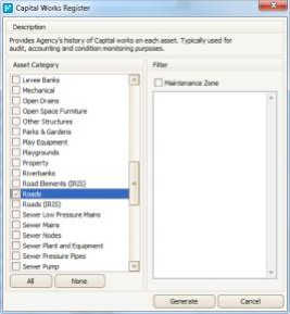 - Select the Asset Categories that your requirement for the Capital Works Register, and click Generate.
