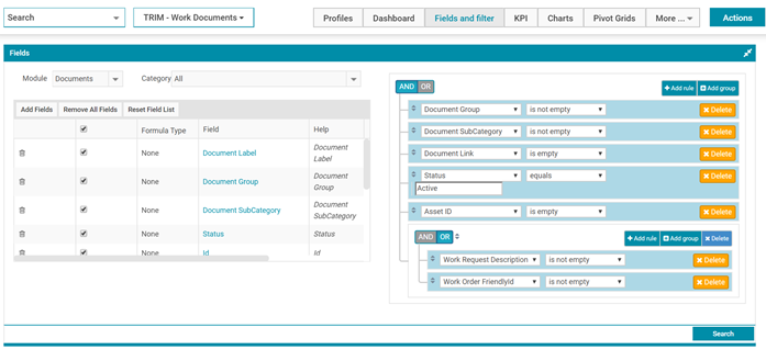 This search profile lists all documents that are not synced to TRIM, primarily based on the External ID being NULL. Other filters may be included to refine the list. This search targets documents associated with assets. A separate search filter is used for documents not directly associated with assets such as Work Requests and Work Orders.
