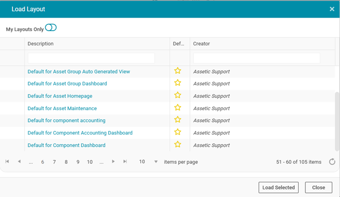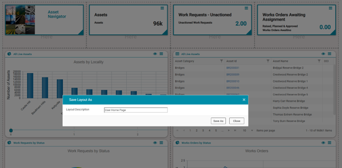 This will save this dashboard under the desired name and make the current user the Layout Owner. Once a Layout has been saved, it is then available when selecting 'Load a Layout' from the Action menu: