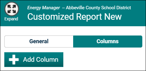 - A pop-up window will appear to Add a New Column. The fields that populate in the window will vary based on the Report Type selected on the General tab. In this example, Historical Use & Cost was selected as the report type.