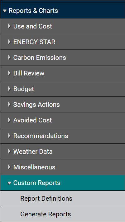 Creating a Custom report in your Energy Manager account gives you the flexibility to build reports that show only the data you want to see. To use custom reporting, you first need to create a Report Definition. Once the Report Definition has been set up, you can generate the report.