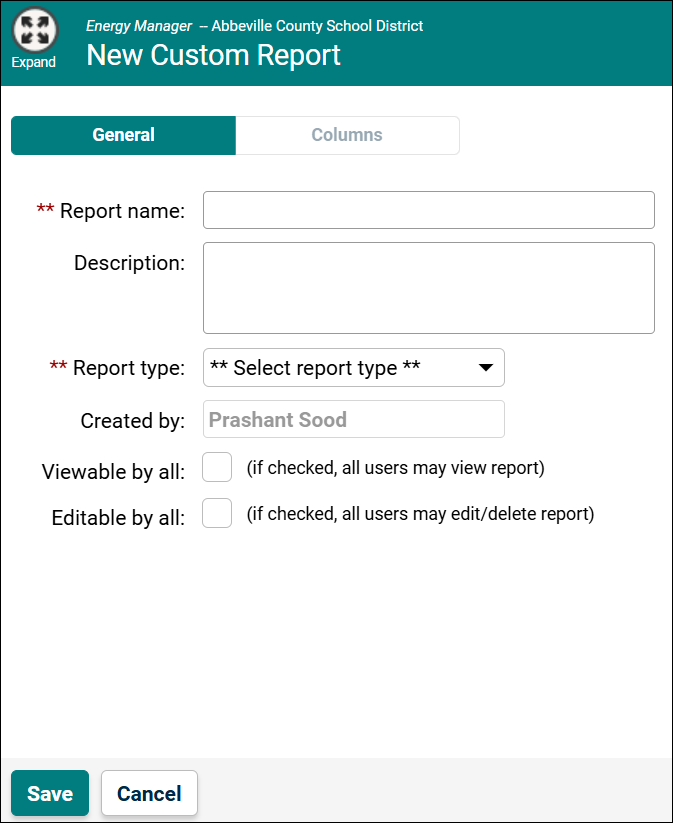 - Report Name: It is recommended to keep this simple but descriptive, so you can easily identify what data the report will return (ex: All Utilities - Yearly Use & Cost per Sq Ft Comparison).