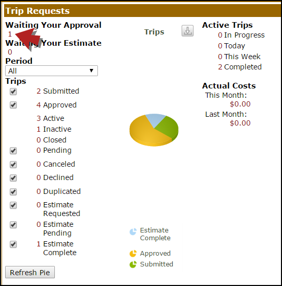 • The Trip Requests section of your home page provides and overview of the trips requests pertaining to your assigned Location(s). You can access trips waiting for your approval by clicking the number under the Waiting for Approval label.