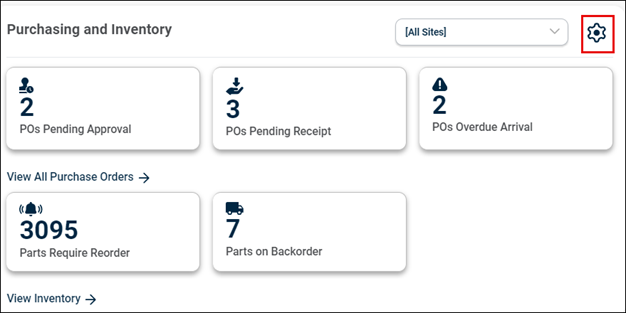 The Purchasing and Inventory Widget presents several cards for the management of purchase orders and parts, each focusing on key aspects of the purchasing process. Each card will show the number of items in the respective category, enabling users to quickly view the status of POs and parts related to their site. Clicking on the cards will navigate to the respective page.