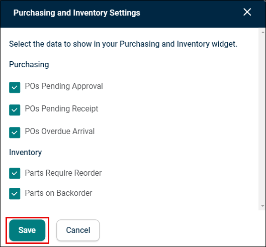 The Purchasing and Inventory Settings screen appears. Check in/off purchase or inventory order categories to display or hide specific cards. (E.g., Users focused on backorders may opt to display only the Parts On Backorder card.)