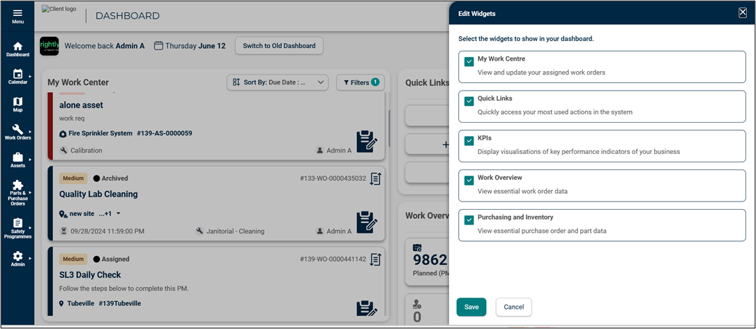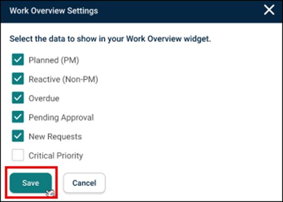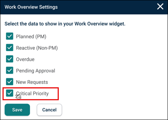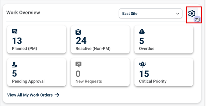 The Work Overview Widget includes Customization Functionality, allowing users to choose which work order cards they want to display.