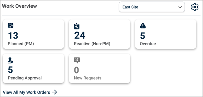 The Work Overview Widget is a new Dashboard feature that provides users with a quick summary of important Work Order categories. This Widget displays the total count of key work order types in a card format, eliminating the need to navigate to the Work Order List section for a quick status check.