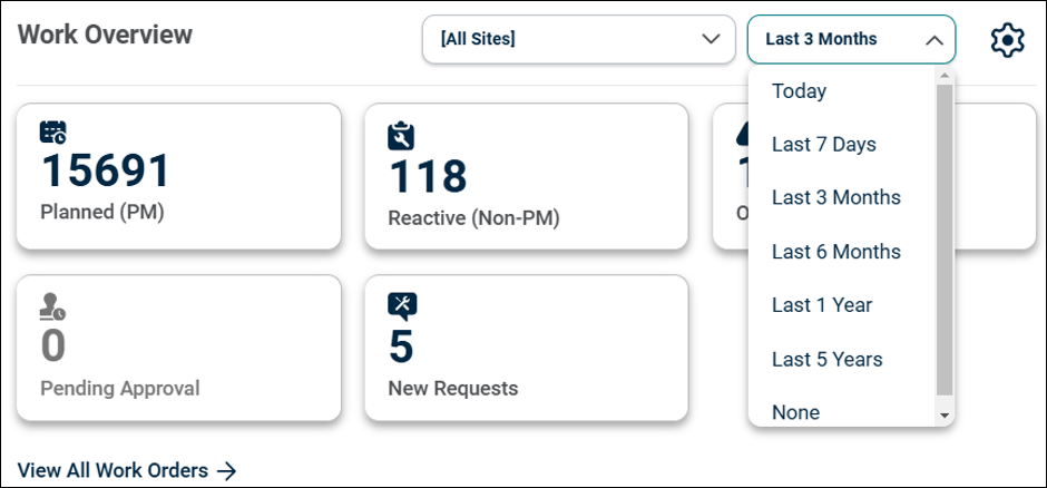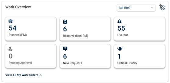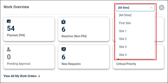 The Work Overview section now includes a site selection filter, helping to view only the work orders relevant to the chosen site.