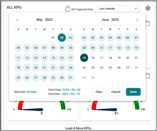 The KPI Widget includes a WO originated date selection filter, helps to view only the KPIs relevant to the chosen date range. By default, Last 3 months date range is selected in the date selection filter. *Note The date filter present in My KPI page will only be used for old dashboard, to add date filter in new Dashboard KPI widget, use the date originated filter present in My KPI widget.