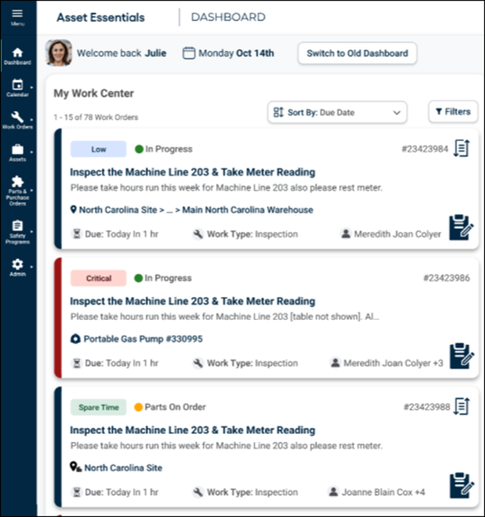Priority Filter: Enables filtering work orders by priority levels.