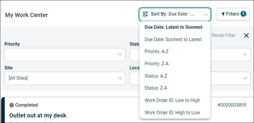 Due Date (Latest to Soonest and Soonest to Latest): Allows users to sort work orders based on the due date. Users have two options to sort work orders using due date. This is the default sorting option.