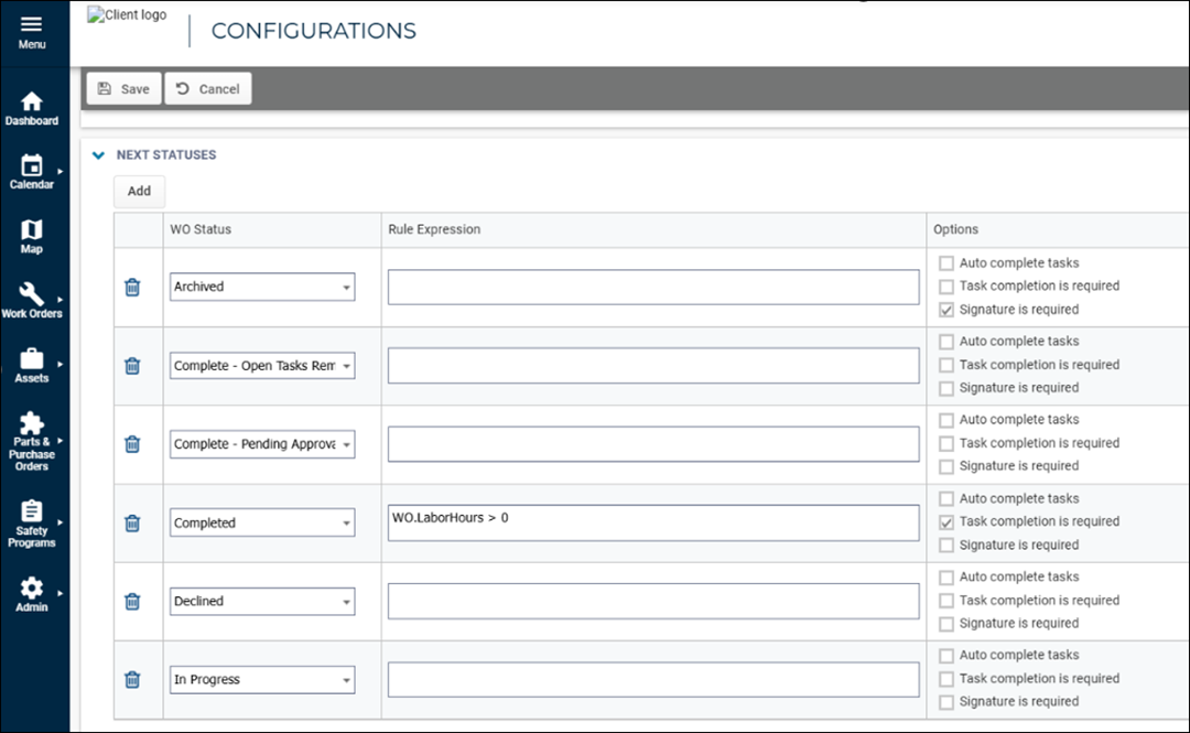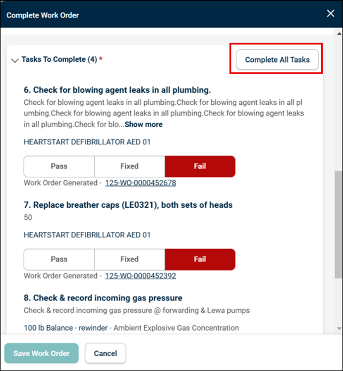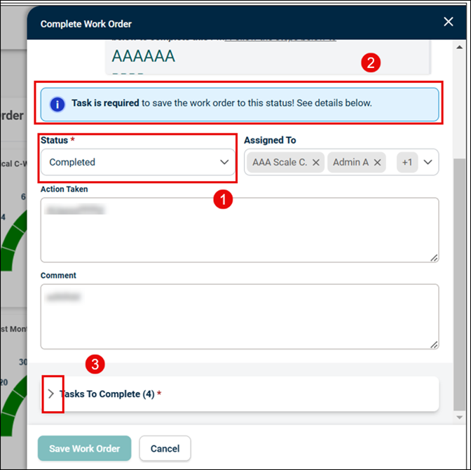 The Tasks to Complete field will become available and marked as mandatory in the Work Order status configuration, the system ensures that all tasks must be completed before proceeding.