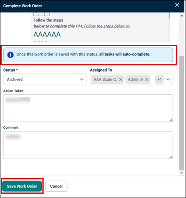 The Save Work Order button will always remain enabled, allowing users to proceed with the update.
