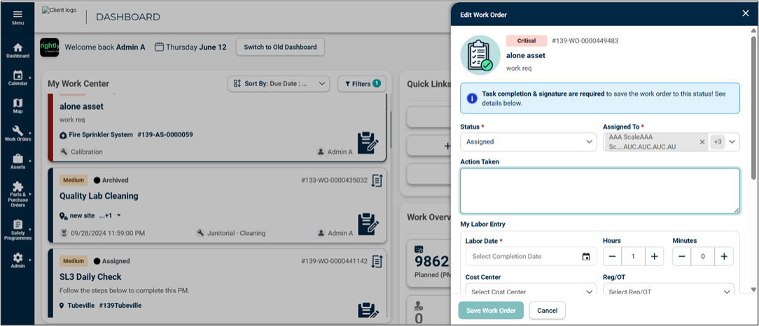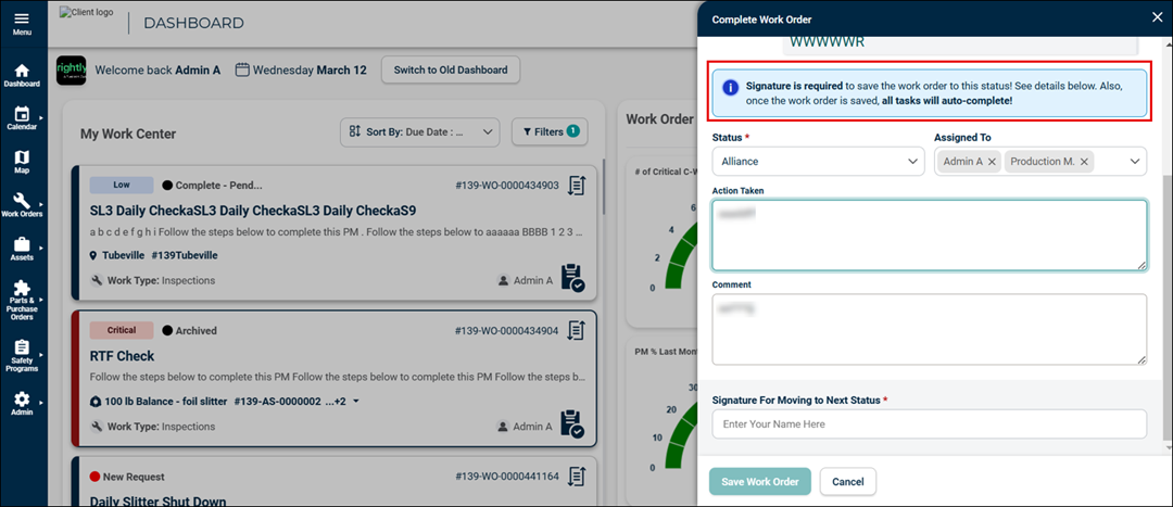 Users are required to enter signatures to move to the next status and save a work order in the Quick Edit Overlay.