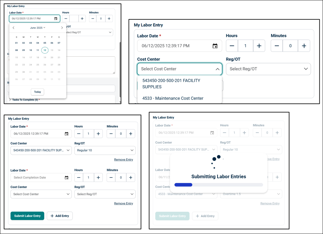 Labor entry:Select the end date inside the Labor Date, click on the +/- icon or type the number of hours worked on, select the cost centre, and Reg/OT from the drop-down menu.