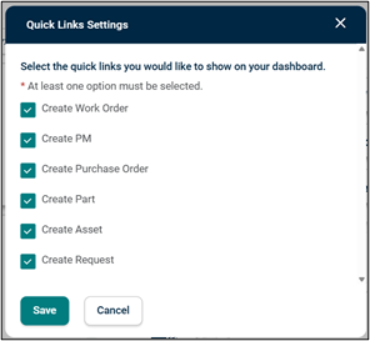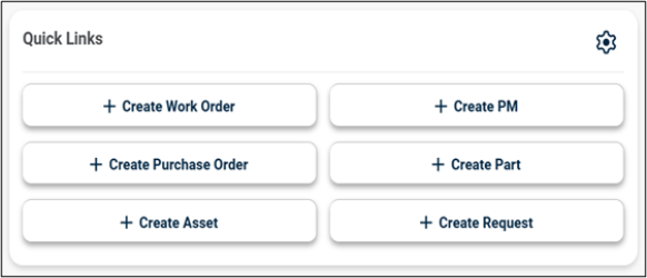 The new Quick Link Widget functionality allows users to create Work Order, PM, Purchase Order, Part, Asset and Request directly from the Dashboard.