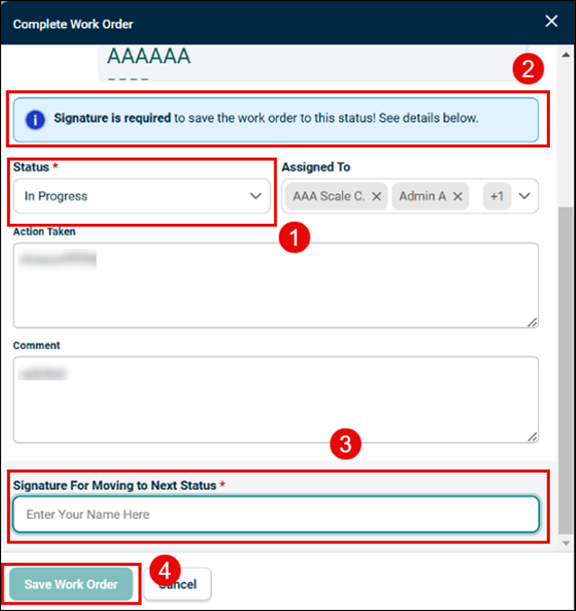 Enter the signature in the Signature For Moving to Next Status field. The Save Work Order button becomes enabled.