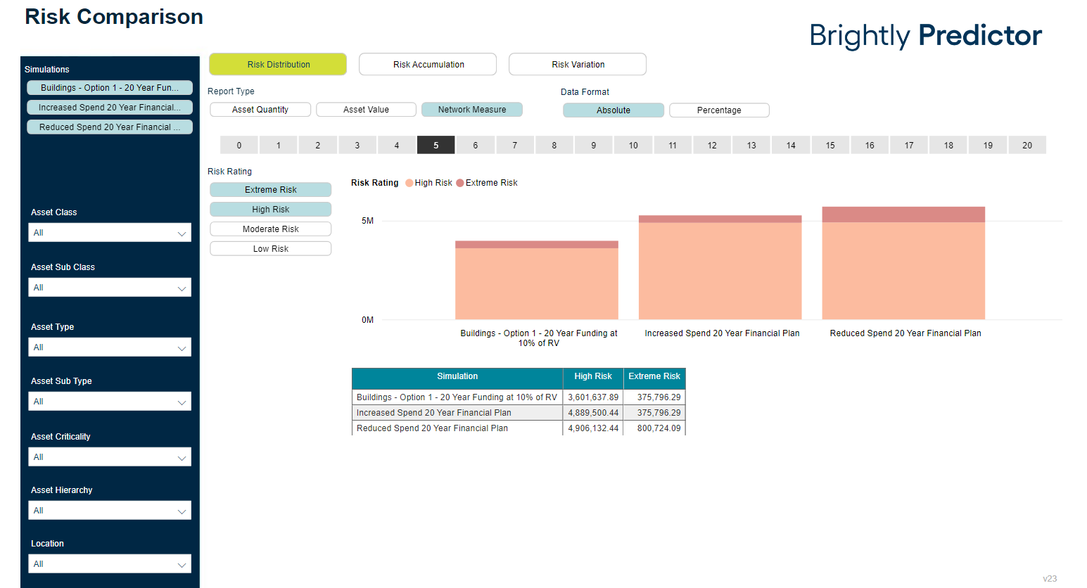 This report allows an organisation to compare the predicted risk behaviour of their asset portfolio as a result of their selected financial strategy.