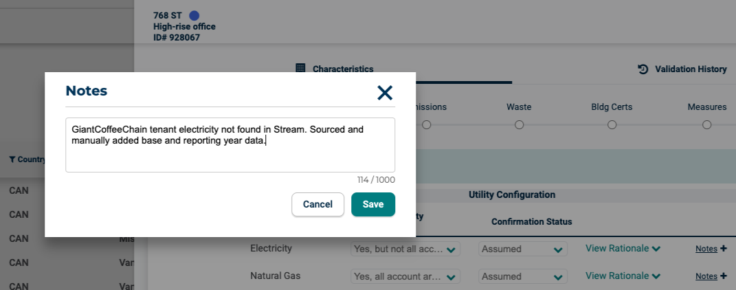 For each utility type, select the correct option in the ‘Complete Utility Coverage?’ dropdown. For example, if there is a landlord electricity account tracked in Stream but there are also untracked tenant electricity accounts, select the Yes, but not all accounts in Stream option in the Electricity row.