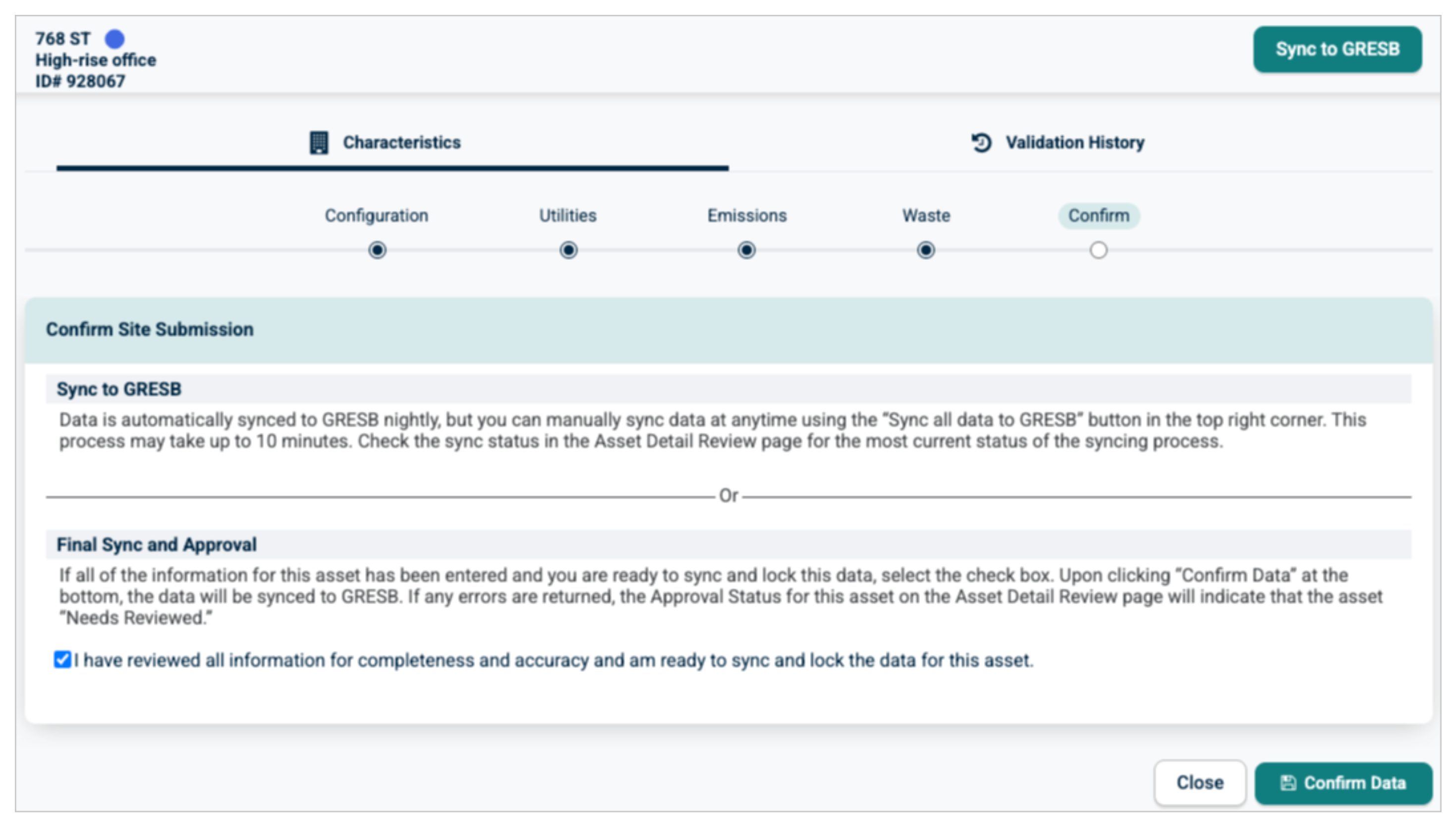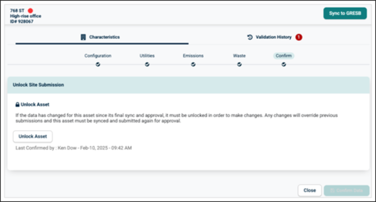 NOTE The Sync to GRESB button is temporarily unavailable because Asset data is automatically synced to GRESB when the data is confirmed.