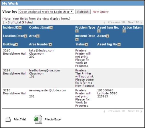 • You can sort the list by Request Age, Incident ID, Priority, Status, Location, Work Queue, or Request Description in ascending or descending order.