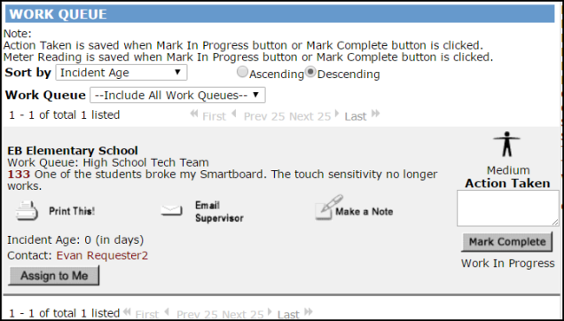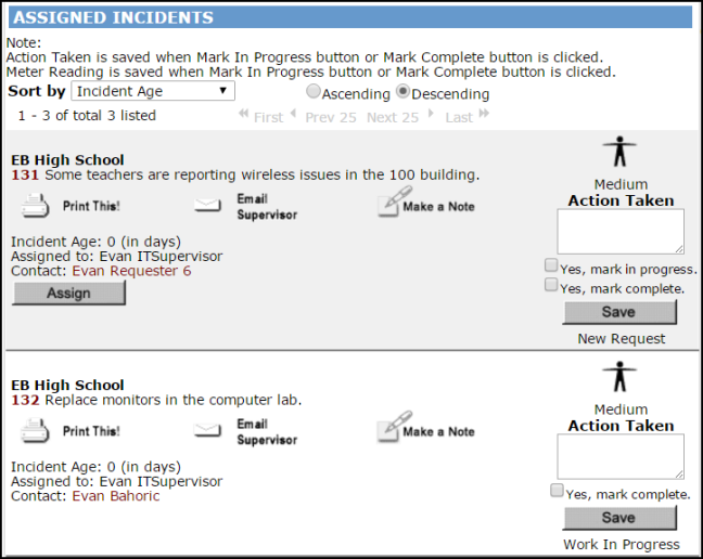 • The Assigned Incidents section of the home page will show a list of incidents assigned to you. From this section, you can print the incident, add action taken notes and today's labor hours, and mark the incident as In Progress or Complete.