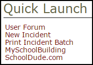 • This section provides commonly used links including the User Forum, New Incident, Print Incident Batch, MySchoolBuilding, and a link to the SchoolDude.com website.