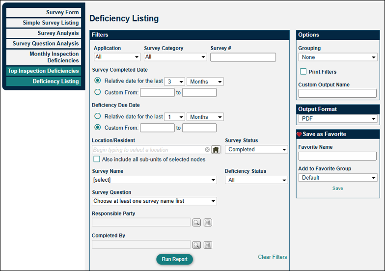 The Deficiency Listing report displays a list of deficiencies, along with details such as: location, survey name, open and close dates, and the service area/responsible party. Use this report to get an accounting of all deficiencies that have been created, who is responsible for corrections, and whether those corrections were completed.