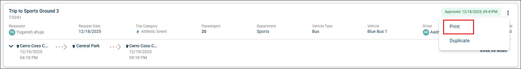 Users can print the trip request by clicking the three vertical dots and selecting the Print option, allowing them to share the details as needed.