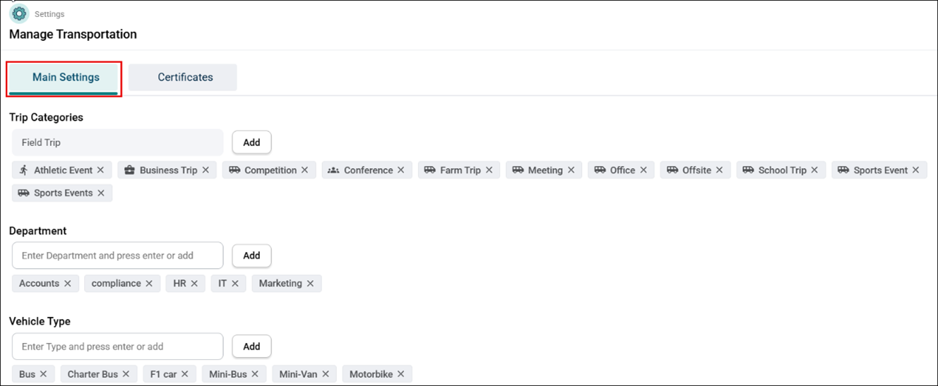 In the Main Settings tab, admins can manage Trip Categories, Departments, and Vehicle Types.