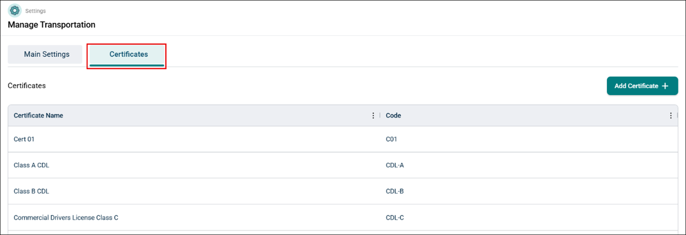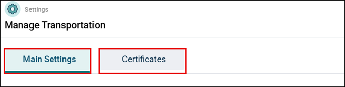 To navigate to this page, click the Settings icon on the left and select Manage Transportation option.