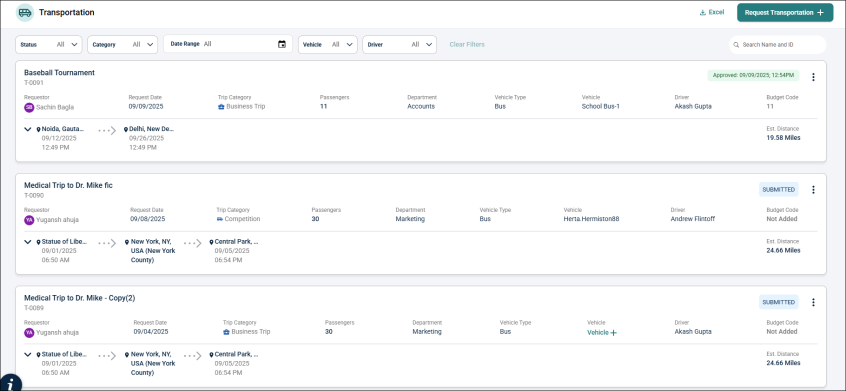 The Transportation dashboard for administrator displays list of trip requests, filters and user profile section.