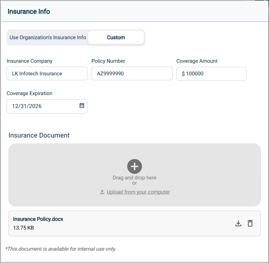 In the Insurance Document section, you can provide an insurance document. Either you can upload it from your computer or drag and drop it in the space provided. Next to the document, you can click the respective icons to download or delete it.