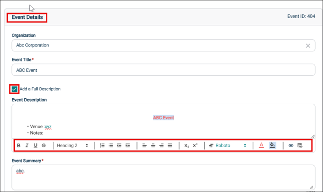 - To enter an event description, select the Add a Full Description check box and enter a description in the Event Description text box. The Event Description has a character limit of 8,000. An error is displayed if you attempt to save the event and the description has more than 8,000 characters.