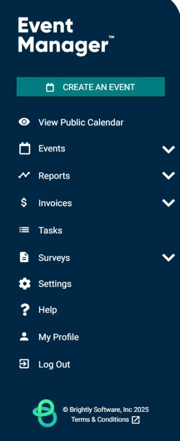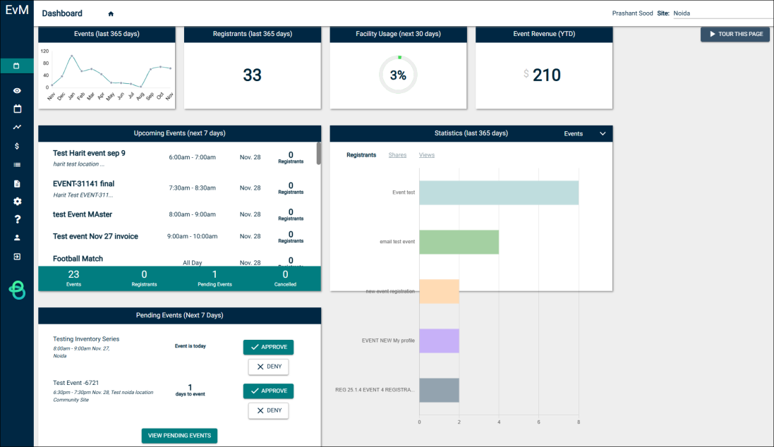The Dashboard acts as your homepage in Event Manager and will give you a quick view of upcoming events, registration information, and events that need approval.