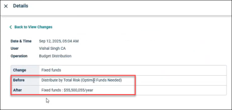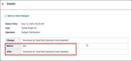 For example, If the initial budget distribution is done on basis of Total Risk, so the log looks like this. The Before field will have NA written as this is the first distribution type that has been allocated to the forecast.