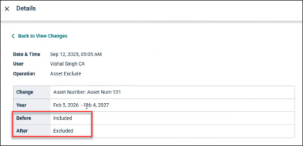 For example, if they include in Forecast is enabled for an asset, then the change log will show it included in After field and excluded in Before field.
