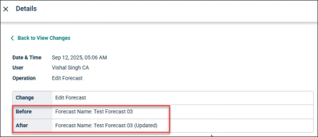 For example, If the name of a forecast and access is changed, then older name and access appear in Before field and new ones in After.
