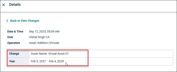 For example, if a user adds a new virtual asset, then the asset name along with the Year is recorded.