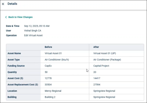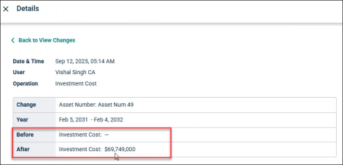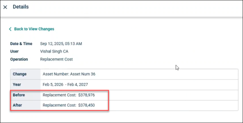 For example, if replacement/Investment cost for an asset is changed, then the Before and After value is recorded.
