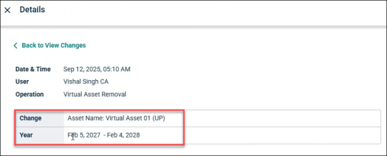 For example, if a virtual asset is removed, then Change and Year are logged for it.
