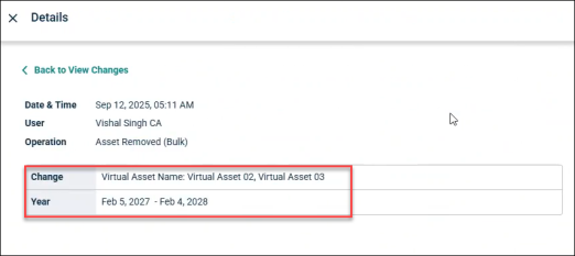 Bulk removal or deletion of virtual assets along with the years it has been removed is logged in the Change log.