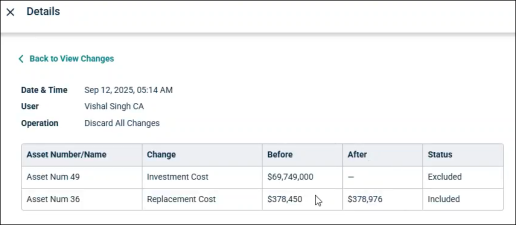 For example, for any asset, along with asset name/number, it will display change in cost before and after along with Exclude and Include status.