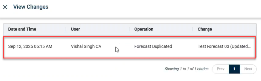 Creation of a duplicate forecast is also logged in the Change log along with the details of the Source of the duplication.