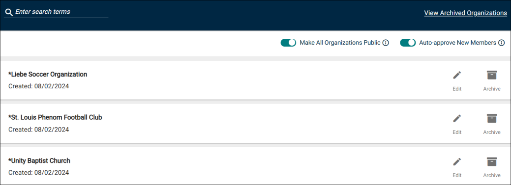 These toggle buttons are used for controlling the visibility and approval behavior of organizations listed on the site. These setting can be configured only by a tenant administrator. Changes made to one site under the tenant reflect on all other sites.
